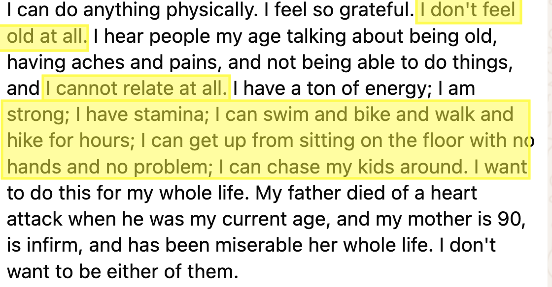 One of my clients, now 51, started strength training three years ago. Today, she says she feels better than she did in her 30s. She swims, hikes, chases her kids around, and gets off the floor with ease — no hands needed. She’s full of energy and gratitude. She doesn’t “feel old” at all. Check out the message she sent me a few days ago:
