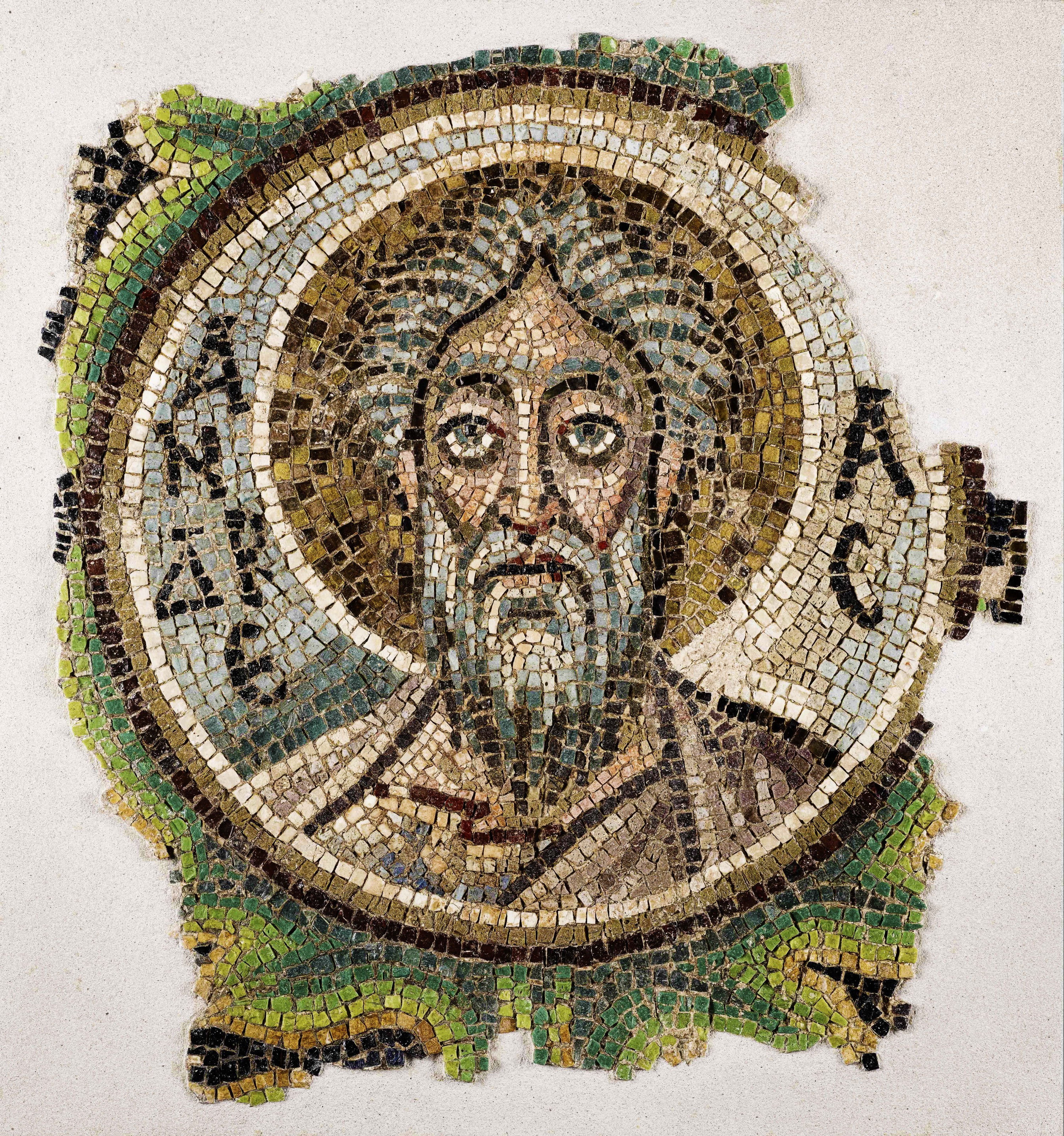 马赛克,公元 6 世纪,塞浦路斯利斯兰戈米卡纳卡里亚圣母教堂半圆后殿,圣母子、天使长及使徒圆形像