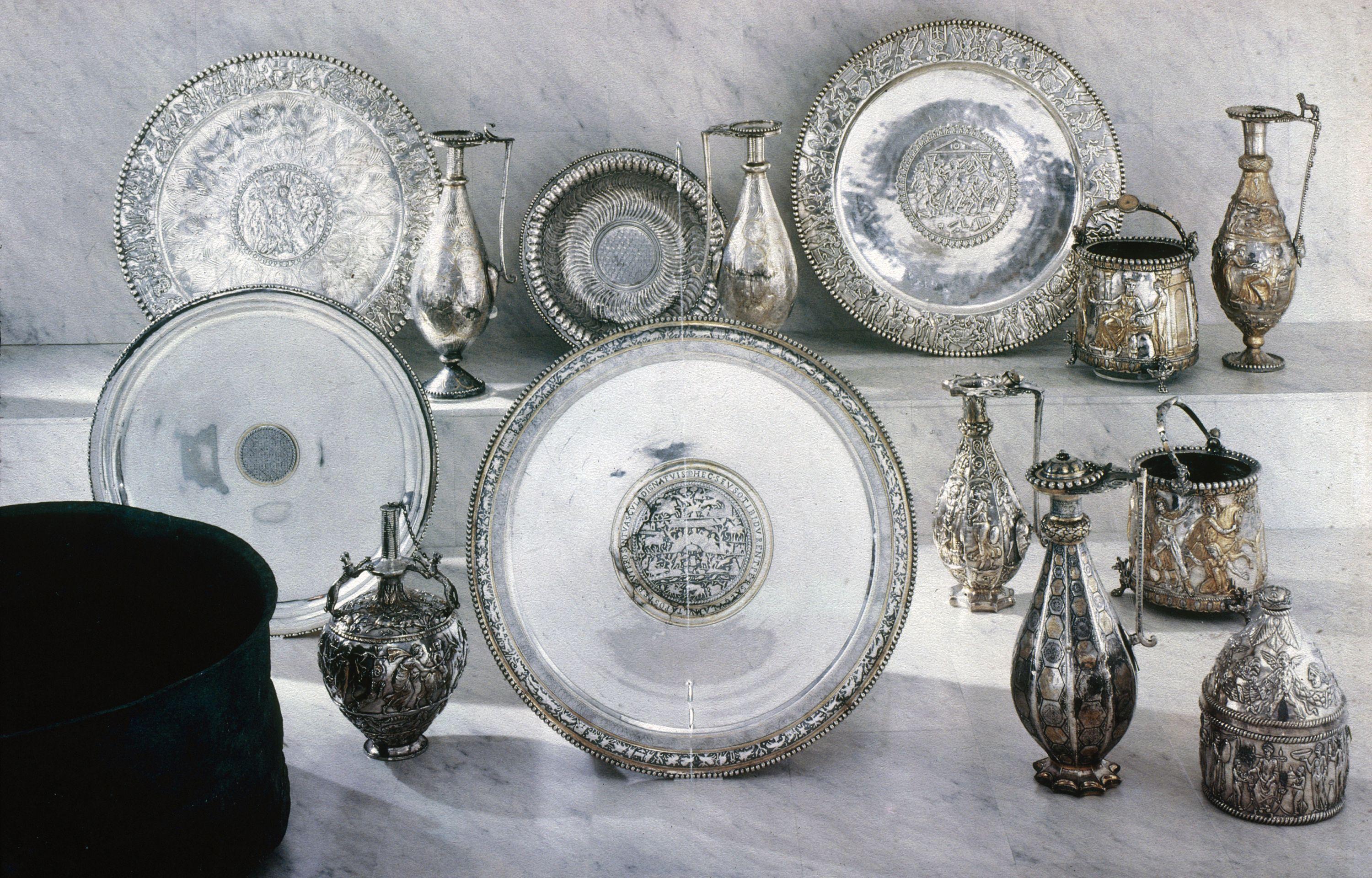 高纯度银,公元 4–5 世纪晚期罗马帝国,14 件银器及 1 件铜罐,总重约 68.5 公斤,包括大型狩猎盘(直径 70 厘米,重约 9 公斤)、水罐、双耳瓶等,狩猎盘铭文提及主人「塞乌索」,约 1970 年代于匈牙利巴拉顿湖附近发现,发现者据称遭谋杀,2014 年及 2017 年匈牙利分两批以约 4300 万欧元购回,现藏匈牙利国家博物馆(Hungarian National Museum, Budapest)